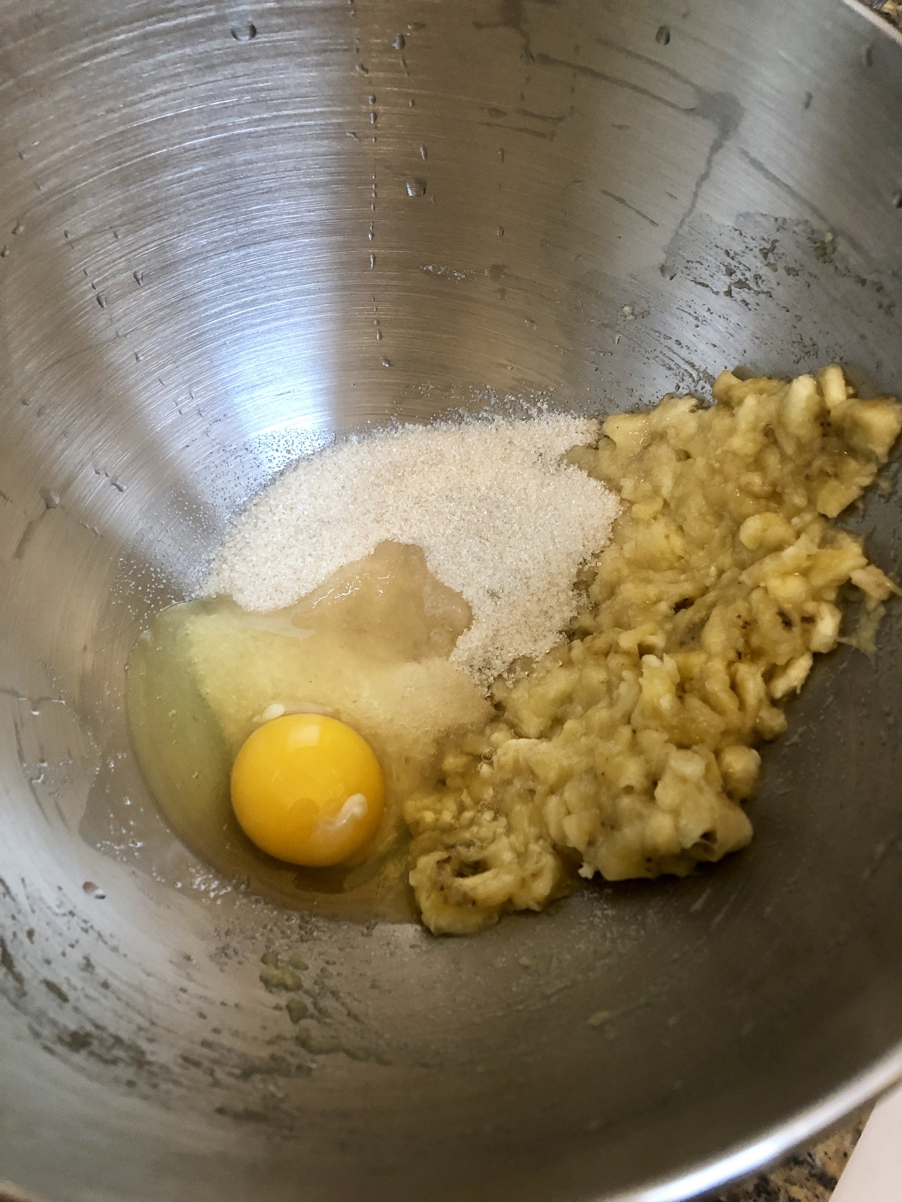 In a large bowl, combine mashed bananas, granulated sugar, brown sugar, egg, coconut oil, and vanilla. Stir until well combined. Add the flour mixture and stir gently with a rubber spatula until flour is mixed in. Squeeze the zucchini in a paper towel to remove excess liquid. Fold the zucchini into batter.