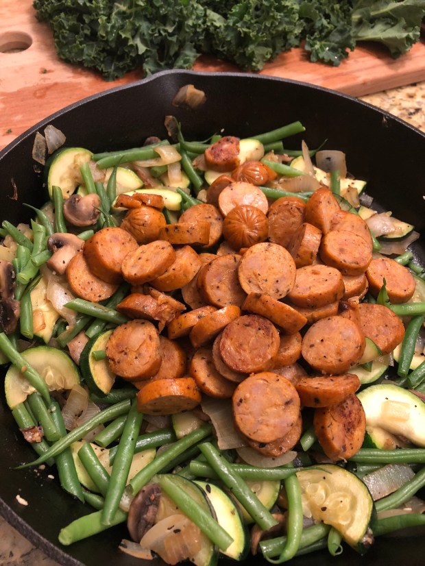 In a pan over medium – high heat, in 2 Tbsp. Avocado oil sauté the onions, mushrooms, zucchini until soft, add salt and pepper. In a separate pan or the same pan sauté in 2 Tbsp avocado oil, the chicken sausage. Reduce to low.