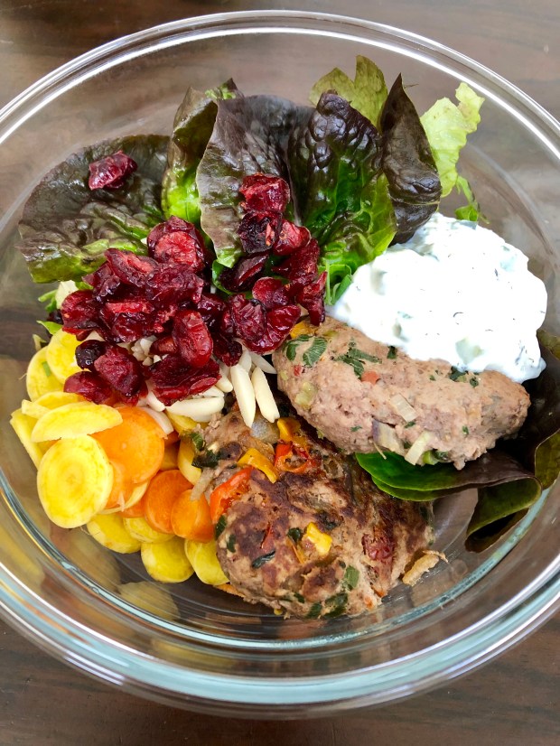 - Steamed brown rice and chopped spinach/lettuce with cucumber, carrot, patties and tatziki sauce.