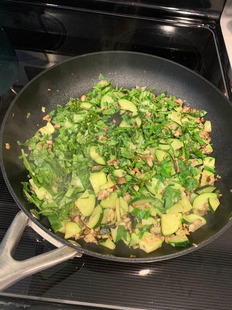 In a large dutch oven or sauce pan (I used a scan pan) heat olive oil over medium heat. Add garlic, zucchini and mushroom and saute until soft. Add spinach and basil and saute another 4 minutes until wilted. Add tomato sauce, mashed tomatoes, tomato paste, oregano, salt, pepper. Mix and let it simmer on low to combine flavors for 15-20 minutes.