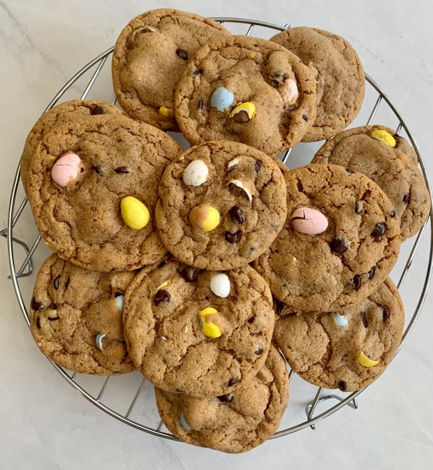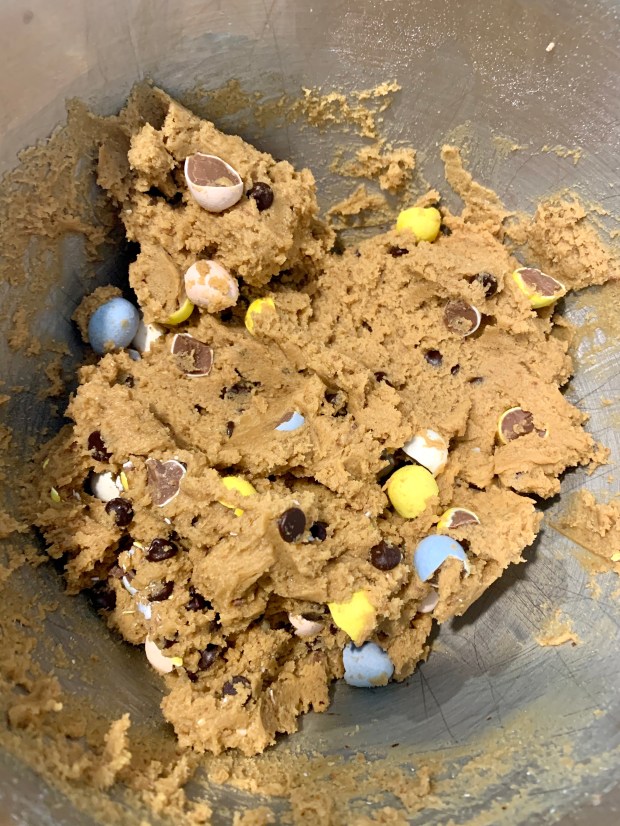 Preheat the oven to 350 degrees F. Line a large baking sheet with parchment paper and set aside. In a medium bowl, whisk together flour, baking powder, baking soda, and sea salt. Set aside. Using a mixer, cream butter and sugars together. Add in the eggs and vanilla and mix until combined. Add the dry ingredients and mix on low until just combined. Fold in the chopped Cadbury Mini Eggs and chocolate chips.
