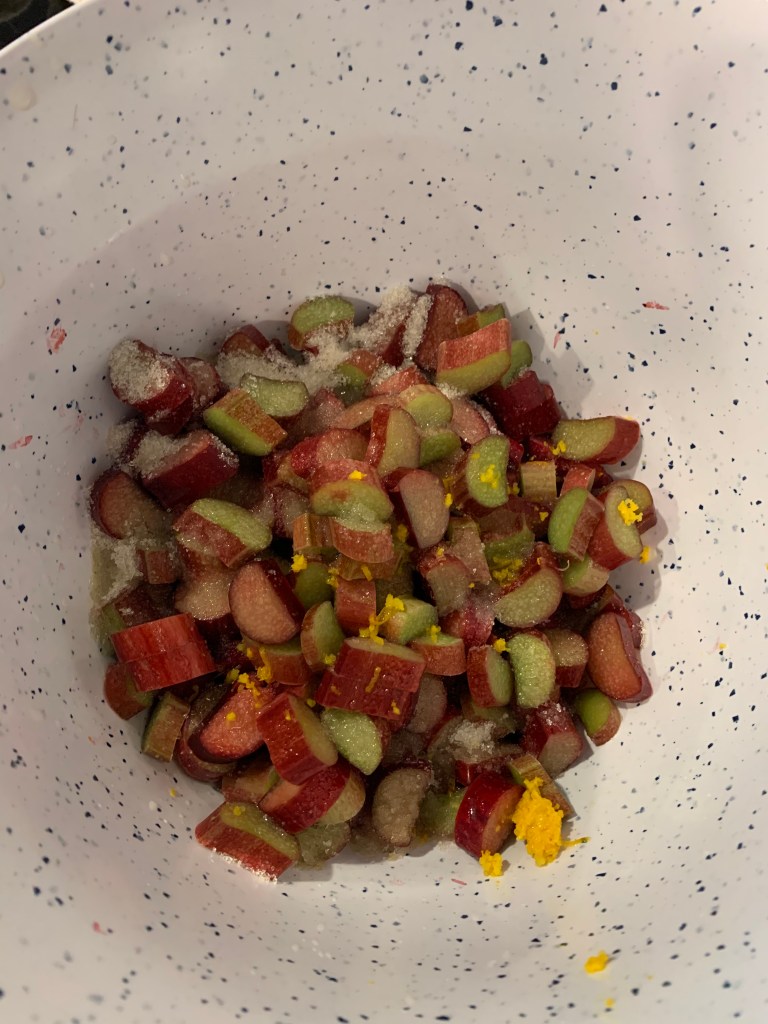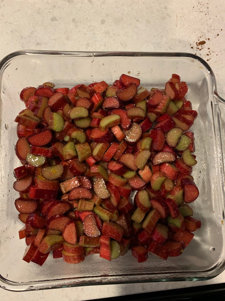 Rhubarb ripens in the spring/early summer. The leaves are poisonous, but the stems are typically used as a fruit in cooking, with a very tart flavor.Chopped Rhubarb with Lemon Zest and SugarBase of the CrispCrumble Layer (pre-baking)Finished Product