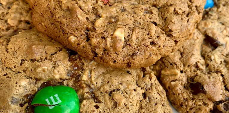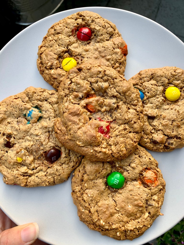 Working with a scoop or ¼ cup measuring cup, drop the cookies onto the prepared baking sheets. These cookies spread while baking, so leave several inches around each (I can bake six at a time). If they are irregularly shaped at the base, gently shape them into a more rounded mound. If you’d like your cookies to look extra pretty, dot a few extra M&M’s and chocolate chips on each mound of dough before baking.
