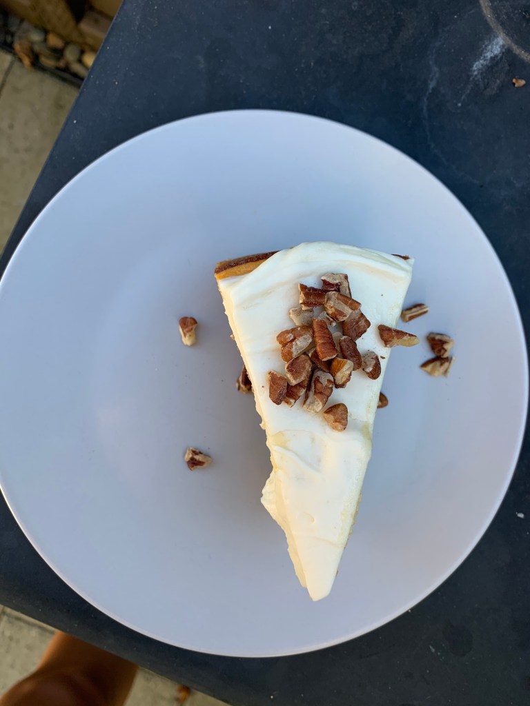 Make the cream cheese frosting. Using stand mixer fitted with a paddle attachment, beat the cream cheese and butter together on medium-high speed in a medium bowl until smooth and creamy. Add the confectioners sugar, vanilla, and salt. Beat on low speed for 30 seconds, then turn up to high speed and beat until smooth and creamy. Beat in 1-2 Tablespoons of milk, depending how thick or thin you want the frosting. Spread onto chilled cheesecake. Top with pecans, if desired.