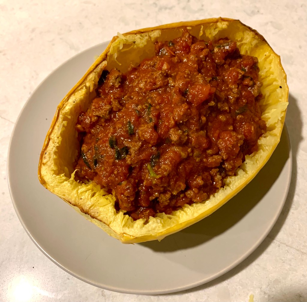 Once the spaghetti squash is done, create noodles by scraping inside with a fork. Leave the squash noodle inside the peel and make bowls out of it by topping with bison bolognese.