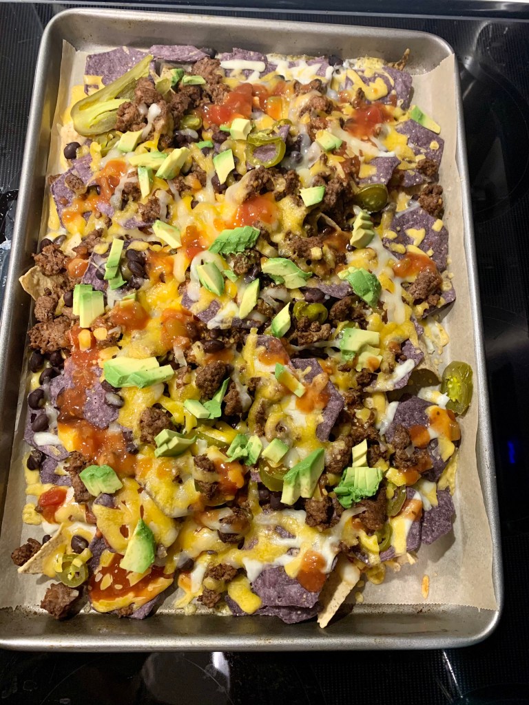 Line a baking sheet with parchment paper. Put a layer of chips down. Top with 1/2 of the black beans, 1/4 cup salsa, 1.5 cups cheese, 1/2 of the bison, 1/4 cup jalapenos. Place another layer of chips, and top with the rest of the bison, 1/4 cup salsa and jalapenos, the rest of the black beans and cheese.