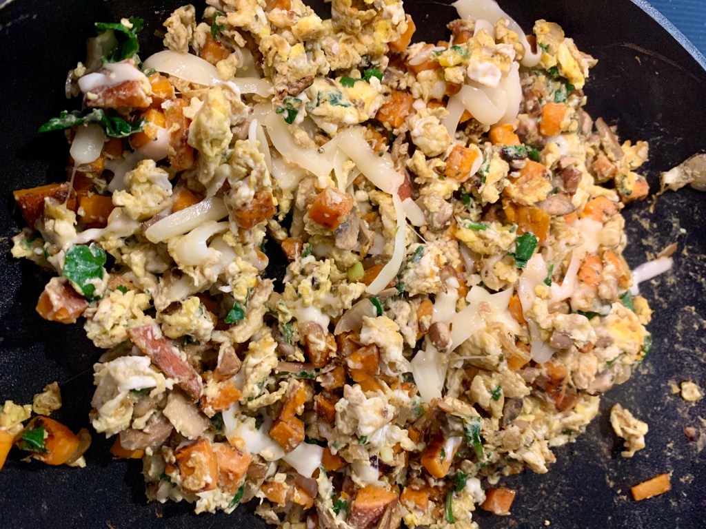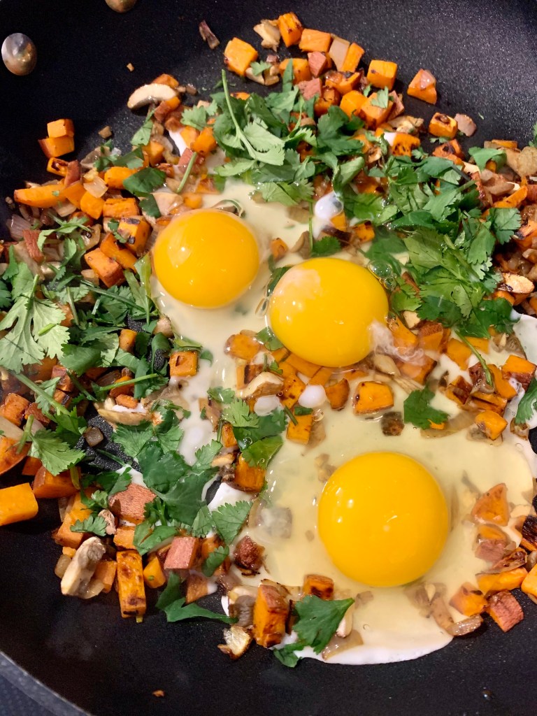 In a non-stick pan (I use a scan pan) over medium heat with avocado oil, saute the sweet potato for 5-10 minutes with a lid on, toss in the onions and cook for another 3 minutes, add the mushroom, spinach, and cilantro and saute for another minute. Crack in 3 eggs and scramble around with the spatula and toss in seasoning (this makes less dishes dirty as opposed to whisking the eggs in a bowl first, but you can do that as well). Top with salsa, cheese, avocado, or hot sauce whatever you prefer!