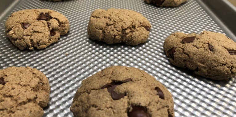 In a large bowl, mix together butter or ghee, olive oil, brown sugar, and unbleached sugar until light and fluffy. Mix in the egg and vanilla. In a small bowl, whisk together the flour, baking soda, cinnamon and salt. Mix the flour mixture into the sugar mixture until just combined. Fold in chocolate chips and oatmeal if you want to add it. If you have time cover the bowl and place in the fridge for 20 to 30 minutes.