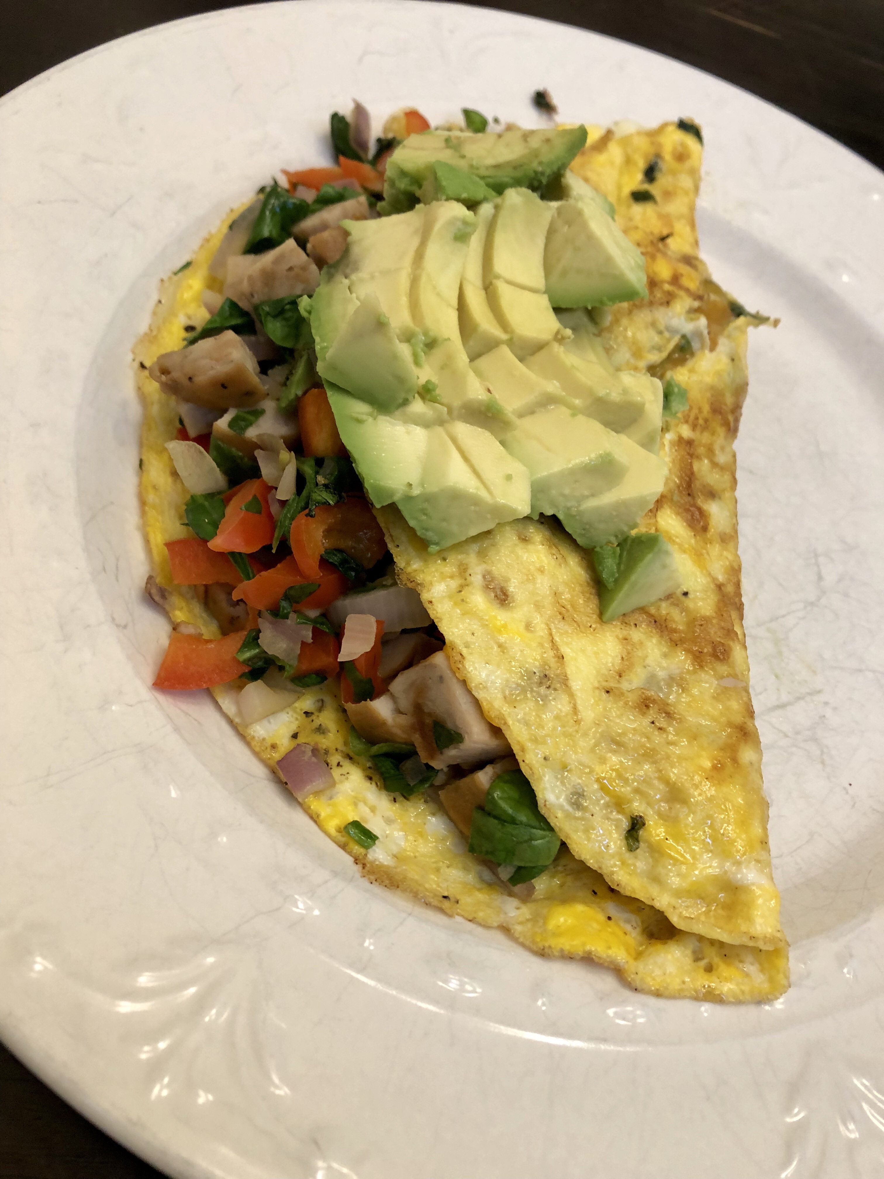 Pour in heated frying pan. Let it cook for a minute, then return the veggies on top and cheese if adding. Fold in half and transfer to plate. Top with avocado.