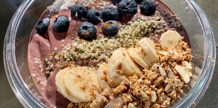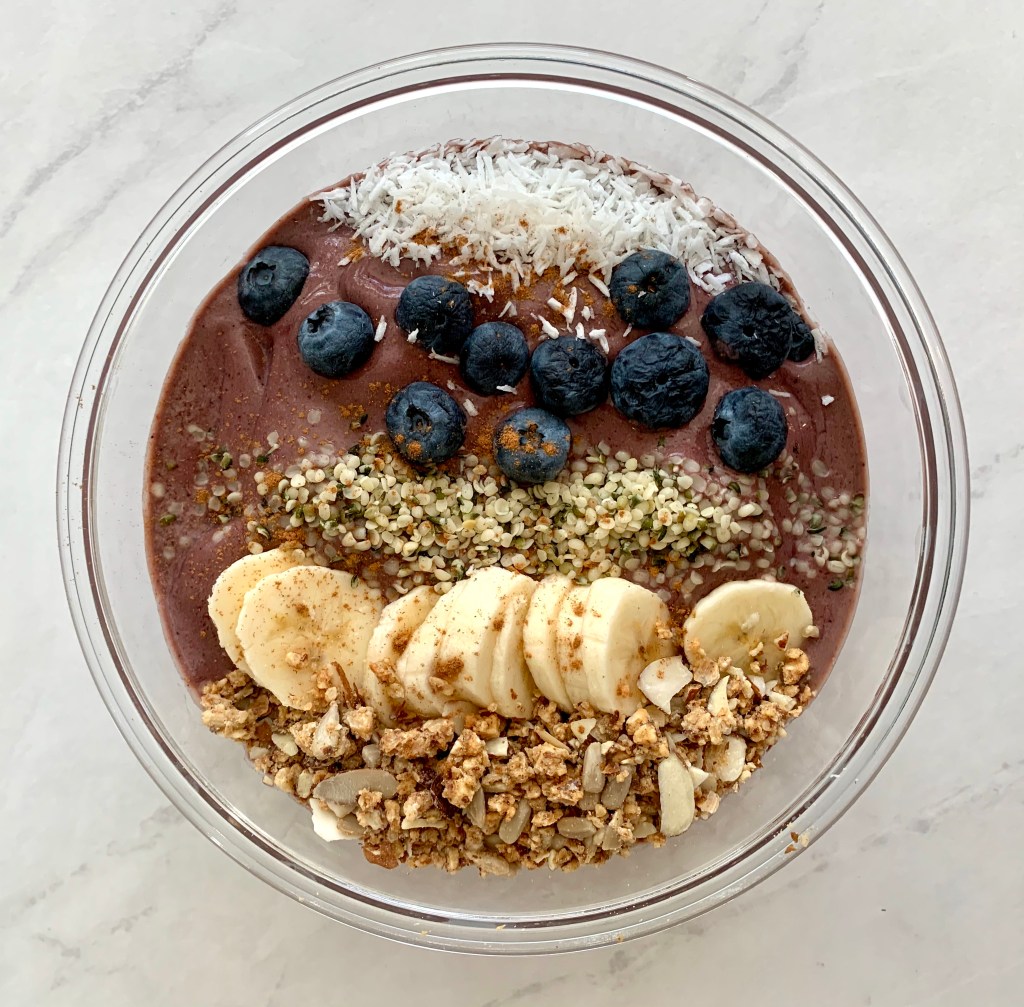 Once Blended scoop everything into a bowl and top with favorite toppings.