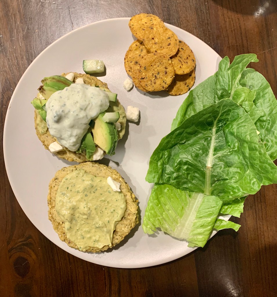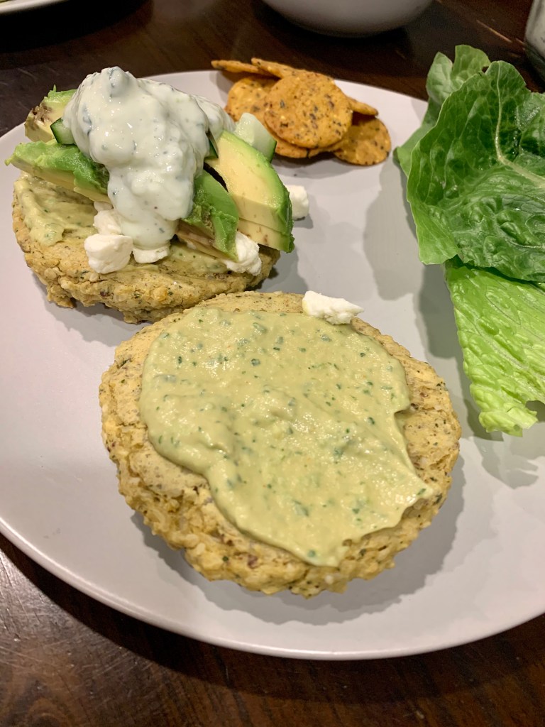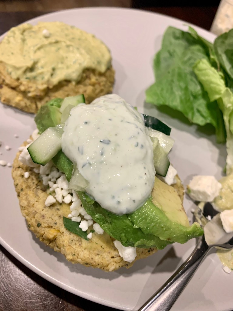 Serve with the hummus, tzatziki sauce, lettuce, avocado slices, tomato slices, red onion and crumbled feta cheese. These can be eaten just like a burger with a bun, or presented as the top and bottom buns with the lettuce, avocado, and red onion in the middle as True Food Kitchen does. Just put 2 tablespoons hummus on the bottom patty, then veggies in the middle, cover with 2 tablespoons tzatziki sauce, sprinkle with 2 tablespoons crumbled feta, and top with a second patty.
